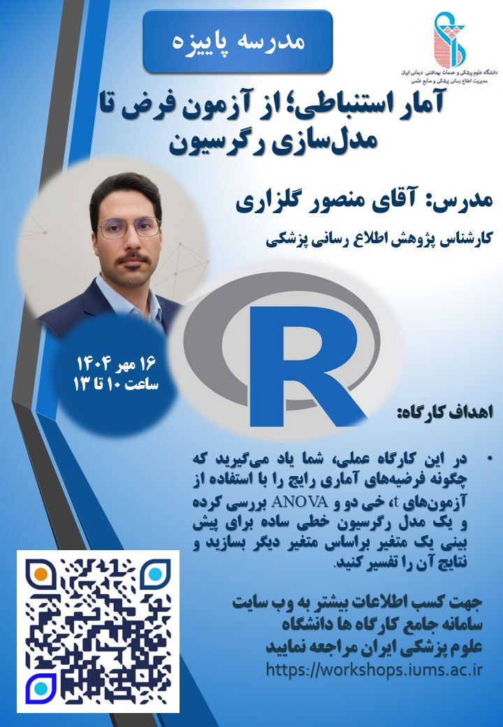 کارگاه آموزشی "آمار استنباطی، از آزمون فرض تا مدل سازی رگرسیون" روز چهارشنبه مورخ 16 مهر ماه 1404 در طبقه چهارم کتابخانه مرکزی برگزار می شود.