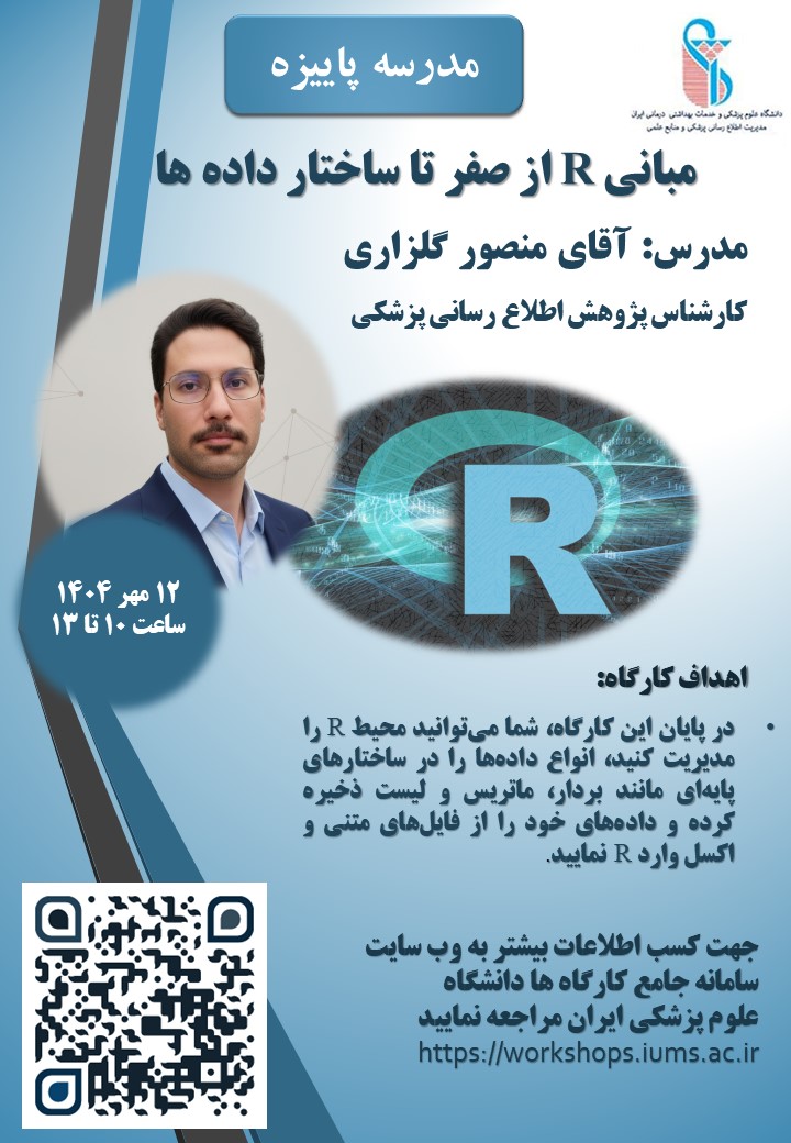 کارگاه آموزشی "مبانی R از صفر تا ساختار داده ها" روز شنبه مورخ 12 مهر ماه 1404 در طبقه چهارم کتابخانه مرکزی برگزار می شود.